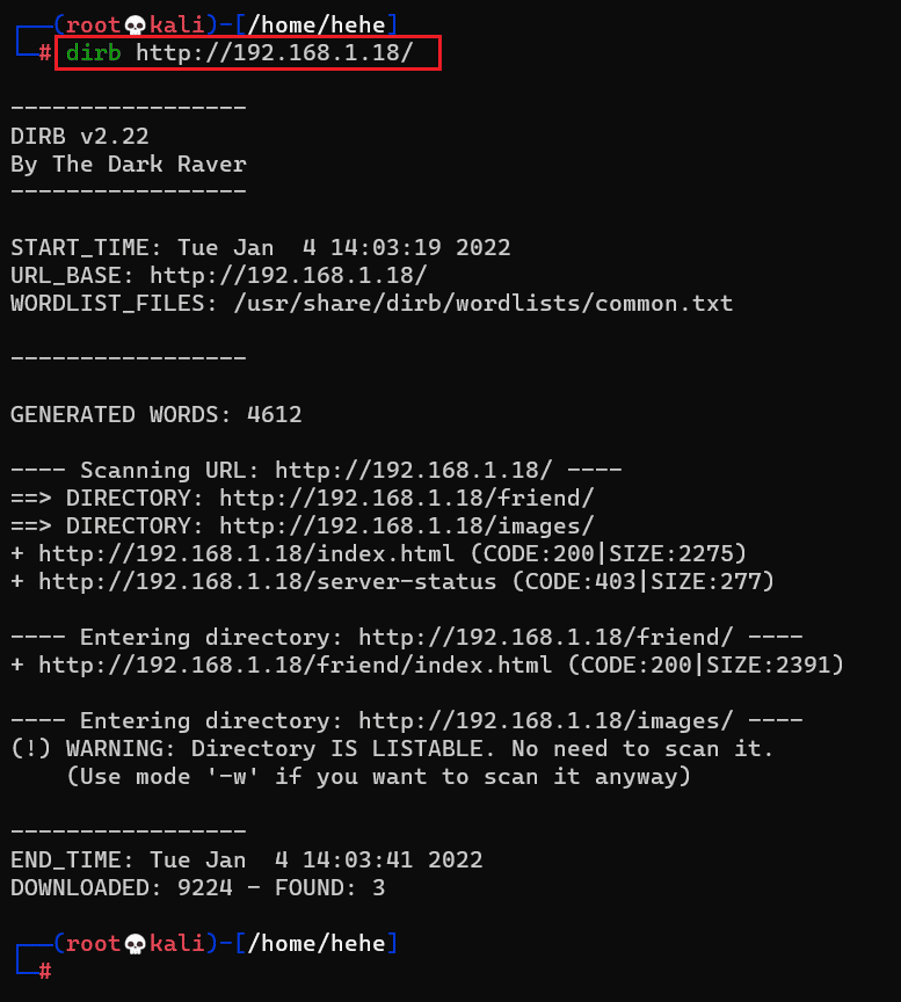 As we can see, there is not much to be explored on the homepage. So, we decided to run a file enumeration scan using an automated file enumeration scanner. We used the Dirb tool as it is a default utility in Kali Linux. The scan command and results can be seen in the following screenshot.