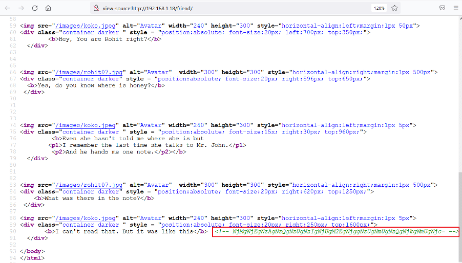 We found another web page, but there is no other functionality to be explored. Let us check the page's HTML source code to find further clues. The HTML source code of the page can be seen below.