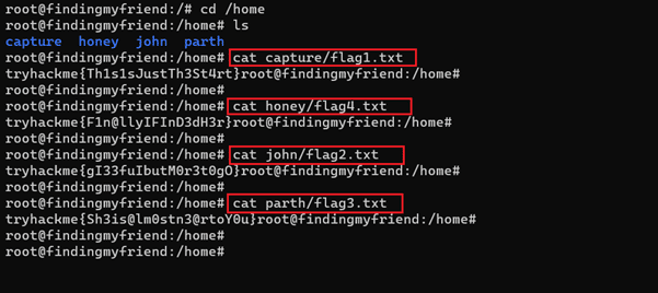 So, it's time to read all the flags and complete the CTF. We moved to the home directory, where we found all the flags that can be seen below.