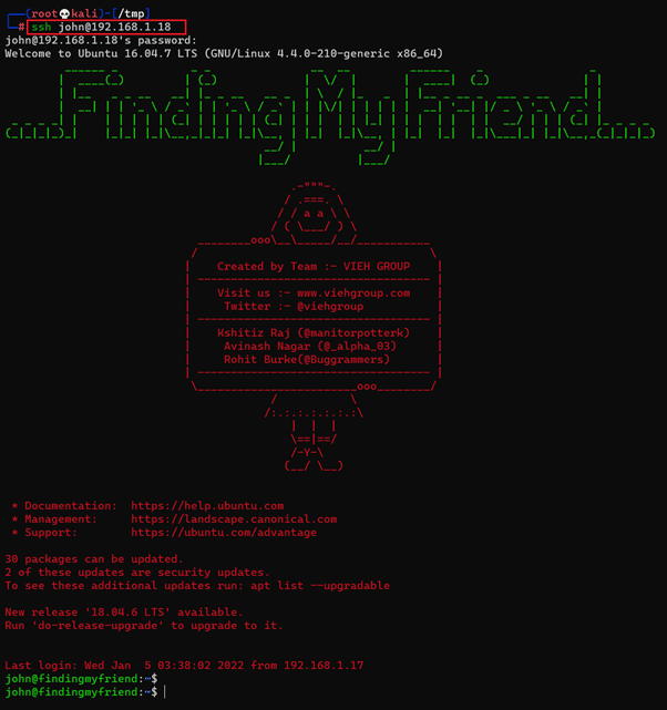 We tried to log in through the SSH port as user' john.' The login attempt failed at first when we used the identified credentials for login. We tried tweaking the identified password for login and found that the password was to be used in lower case. Thus, the login was successful, and we were granted access to the target machine as user' john'.