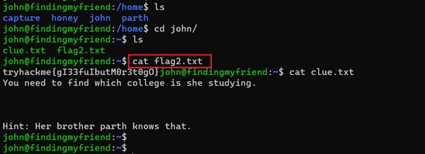 We started exploring the target machine files and folders. In the user's user directory 'john,' we found our second flag, 'flag2.txt'. The flag file was read using the cat command, as seen in the above screenshot. Along with the flag, there was one more file named 'clue.txt'. The hint mentioned a username 'parth' on the target machine, which we noted for further use. As we have user access to the target machine, let us dig into the target machine to identify loopholes and weak configurations which could help us gain further privilege.