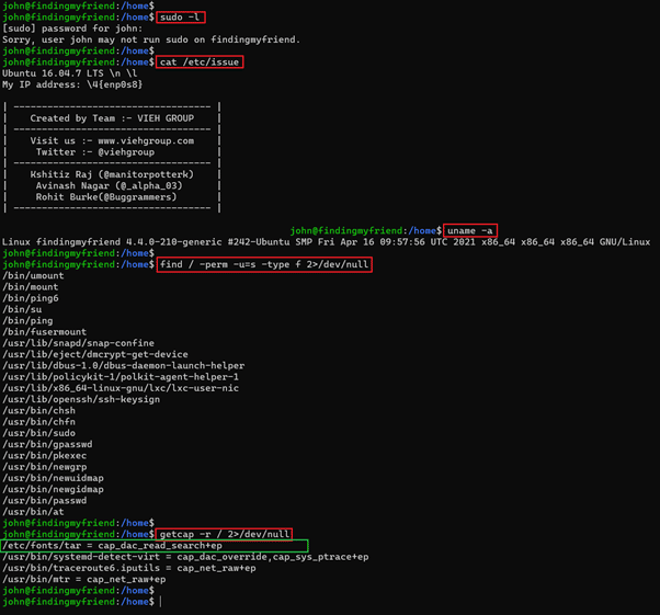 We ran the 'sudo –l' command at first to check the sudo permissions for the current user. The command returned an error as user 'john' did not have permission to run the sudo command. After that, we used 'uname –a' and 'cat etc/issue' commands to know the operating system and kernel-related version information. The identified version details can be seen in the above screenshot. We searched the information over Google for an available exploit, but no exploit could be found useful for our case.