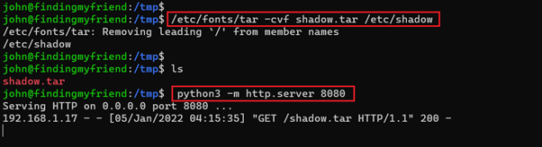 We used to find and getcap commands to identify any other weak file permissions and configurations. After checking the output, we found that the tar command can be used to compress any file on the target system. So, we decided to compress the shadow file as this is the only file that contains the user password hash.