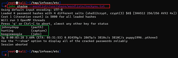This step will use a password cracker tool to extract clear-text login details from the shadow file. We used the 'John the Ripper' tool for this purpose, which is available in Kali Linux. We started the scan using the default wordlist' rockyou.txt.' The scan results can be seen in the following screenshot.