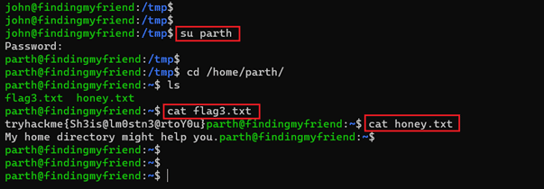 At first used the su command to switch the current user to 'parth.' We provided the identified password, and the current user was successfully changed from 'john' to 'parth.' After that, we checked the user directory for any interesting files. We found the third flag and one more file in the user directory. The file 'flag3.txt' is the CTF challenge's third user flag, which can be seen in the above screenshot. We opened the 'honey.txt' file, which contained a message to check the home directory. We could not understand much from this hint, so we kept on exploring the target machine for further clues