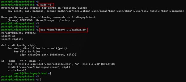 We found a python program file 'backup.py' owned by user' honey.' The current user can run the program. We opened the file by using the cat command and studied the program. We tried to bypass this program to take access as user 'honey'; however, none of the techniques worked. After spending much time on this, we ran a local privilege escalation enumeration script that shows that the 'pkexec' utility can escalate user privileges. So, we decided to exploit it to gain root user access to the target machine.