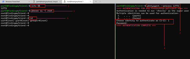 - We used the pkexec command with sudo root, which opens an authentication option on another terminal where we were asked to enter the identity.
