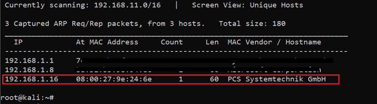 In the above screenshot, we can see that we have identified the IP address of all the devices connected to our router but due to security reasons, we have hidden the MAC address of my personal connected devices. Our target machine's IP address that we will be working on throughout this challenge is 192.168.1.16 (the target machine IP address). We will be using 192.168.1.19 as the attacker IP address.