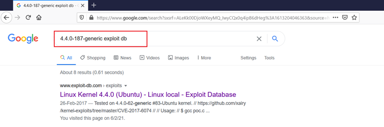 First, we ran the cat/etc/issue command, which tells us that the operating system running version is Ubuntu 16.04, an older version of Ubuntu. After that, we ran another command which tells us the running kernel version. Now we have the information about the running operating system and kernel. Let’s search the local exploit online. As we know, lots of privilege escalation vulnerability exists in the Linux operating systems.