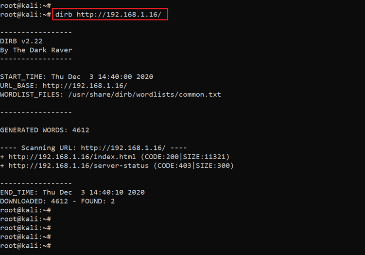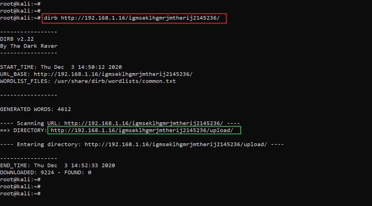 Command used: << dirb http://192.168.1.16/igmsek1hgmrjmtherij2145236/ >>
