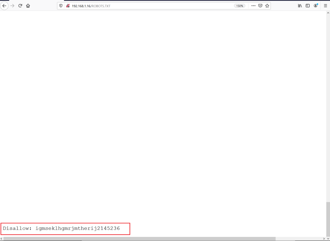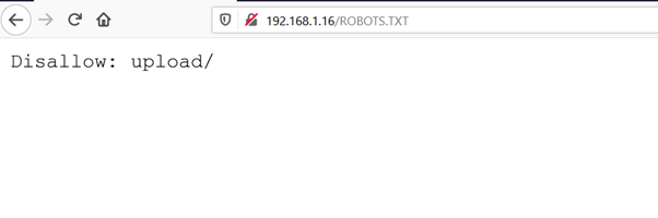 As can be seen in the above screenshot, the output shows that the dirb scan is completed. However, it does not identify anything on the target machine. During the manual enumeration, we get the ROBOTS.TXT file, which can be seen in the below screenshot.
