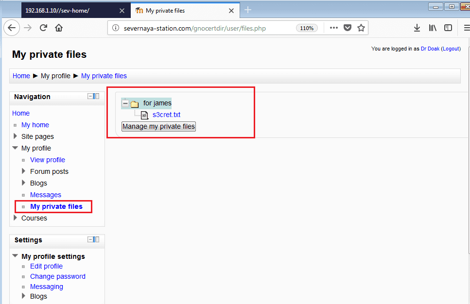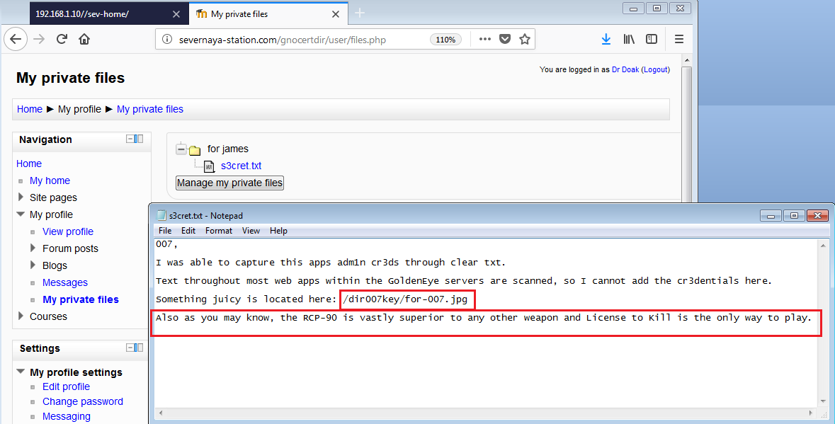 In the screenshot, it can be seen that we have logged in as user “dr_doak” in the application. I started exploring the application for any further clue. After looking around for a while, I found another private file: