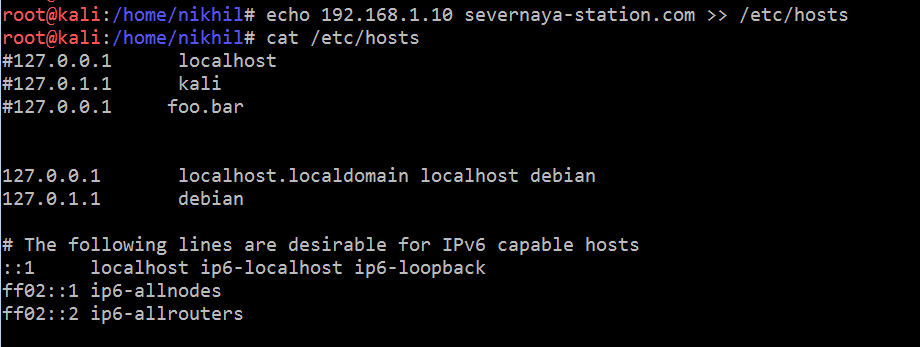 - echo 168.1.10 severnaya-station.com >> /etc/hosts (It will add the entry in the host file. The highlighted IP address is the target machine IP address which could be different as per your network configuration.)