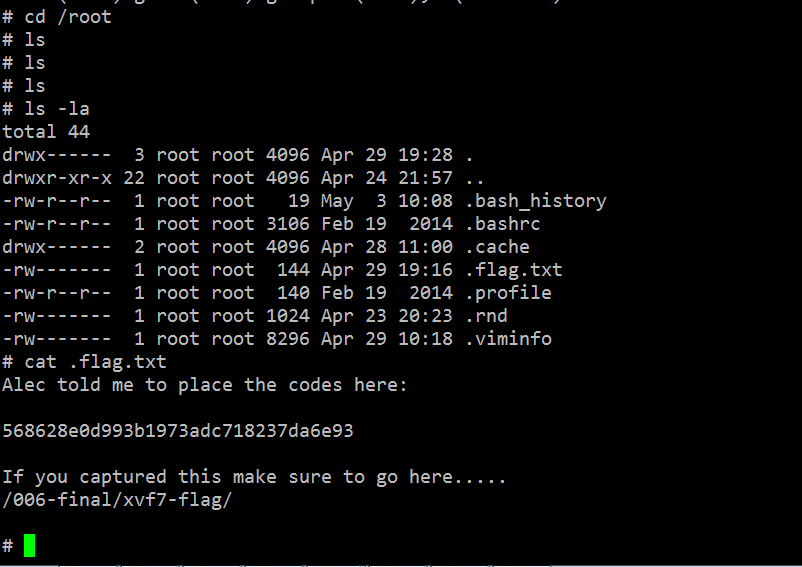 According to the description of the challenge, the goal is to get two flags from the target machine. This was not a difficult task, as both the flags were in the root directory. Let’s read the flags.