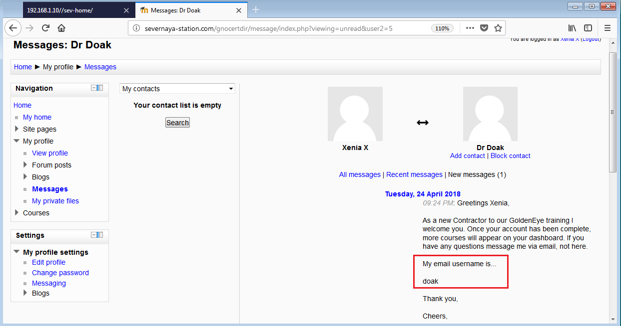 As seen in the above screenshot, we have successfully logged in through the POP port as user “doak.” There was one message, giving us more login credentials to log into the application. Let’s try to login with these credentials.