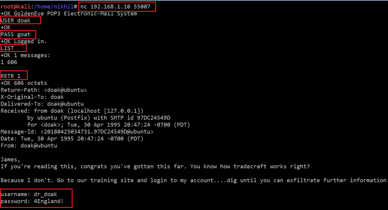 You can see that the tool has successfully cracked the password for the user “doak,” which is “goat.” Let’s try to log in with these credentials on the POP port.
