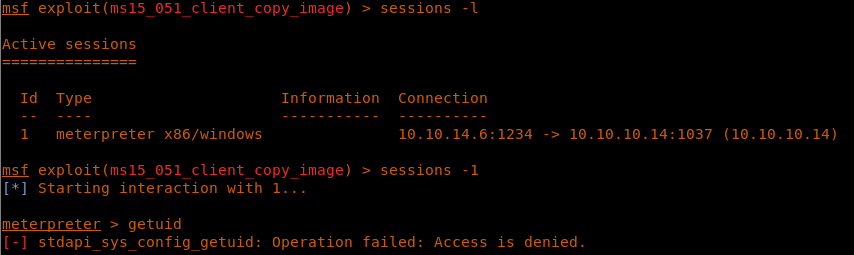 32. We run the exploit and it failed as well, since the current Meterpreter shell from SESSION 1 does not even have the permissions to perform getuid.