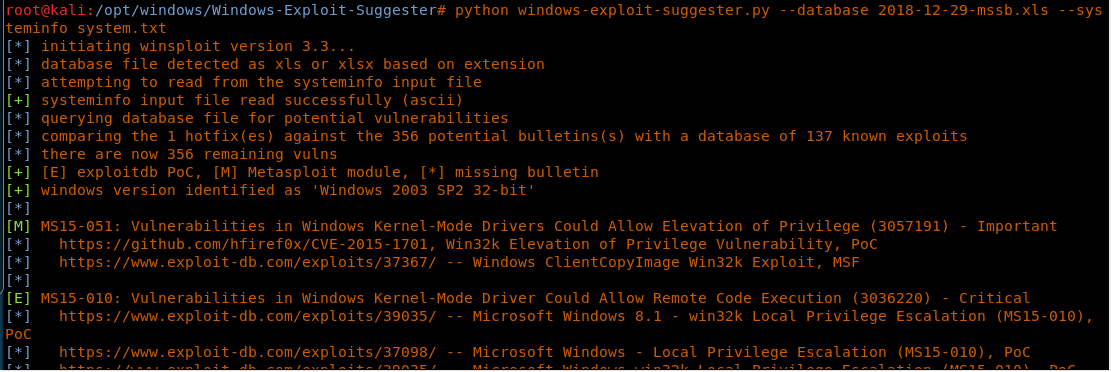 << python windows-exploit-suggester.py --database 2018-12-29-mssb.xlsx --systeminfo system.txt >>