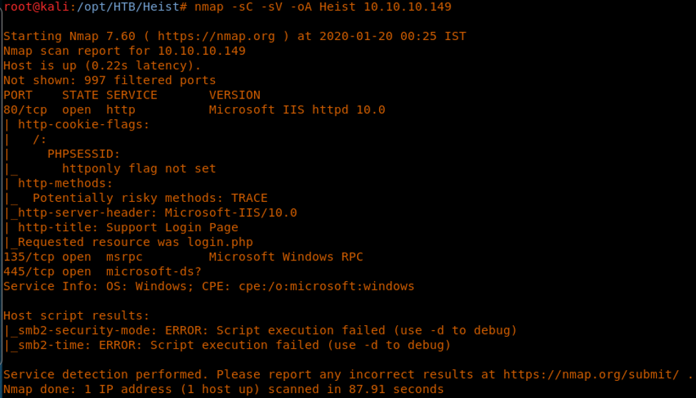 <<nmap -sC -sV -oA Heist 10.10.10.149>>