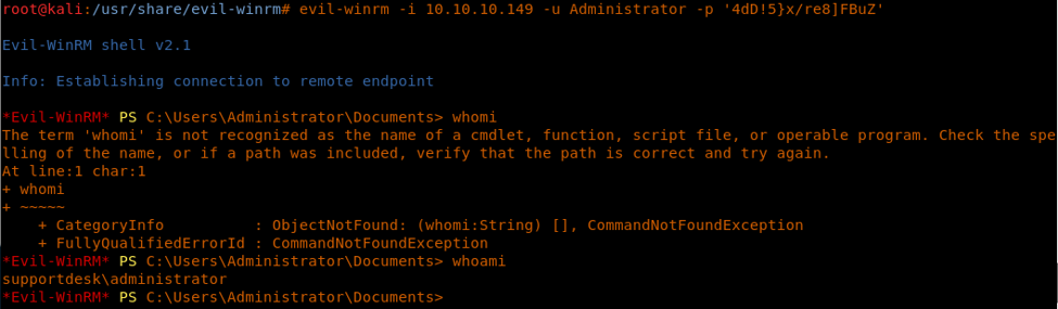 15. We have again a hit a block. Let’s try to get in via WinRM. Below we are using evil-winrm.