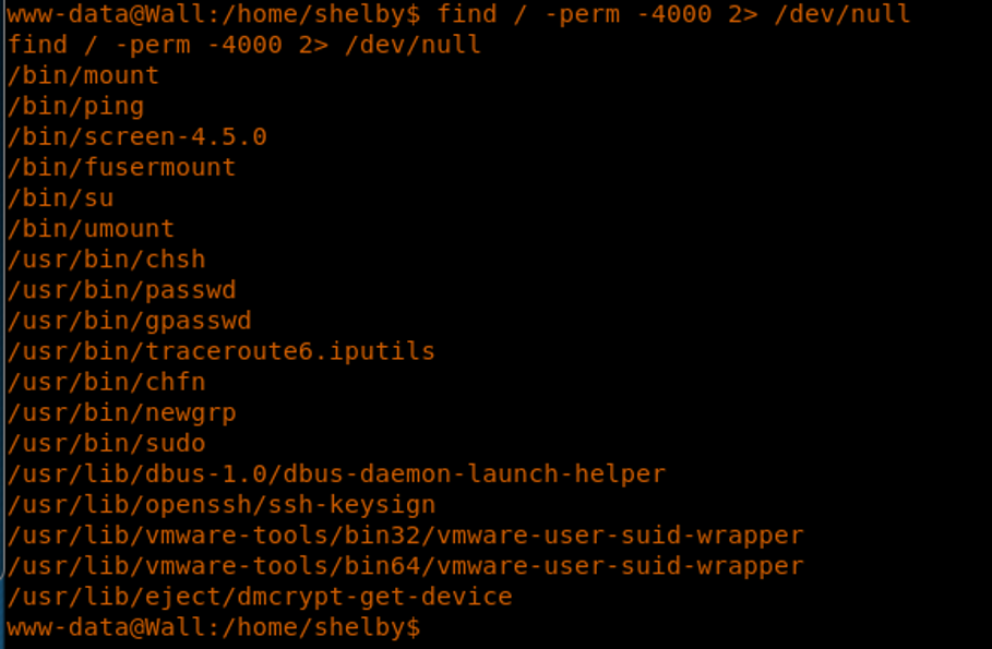 28. Checking the SUID bit reveals that the screen utility has that set the version is vulnerable to local privilege escalation.
