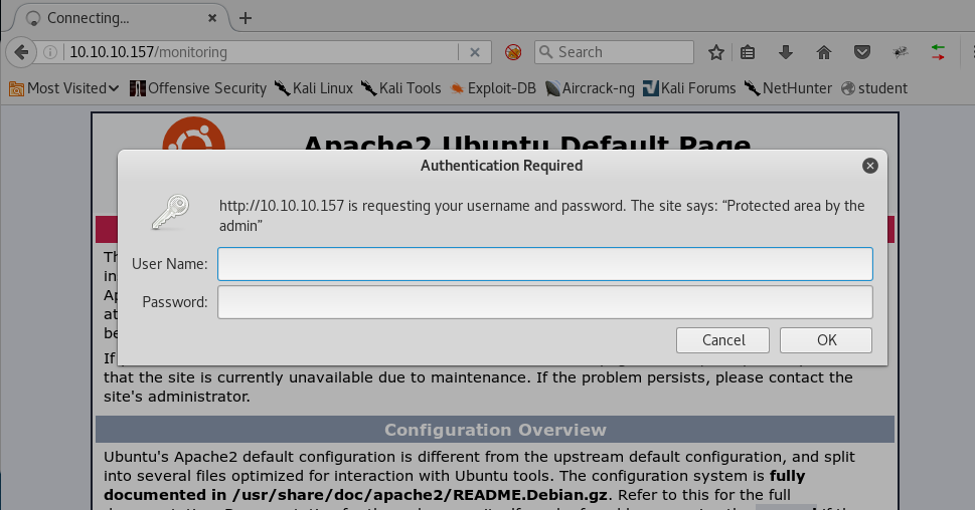 8. One interesting directory is called “monitoring.” Let’s start enumerating the /monitoring endpoint. Below is the authentication dialog that we get for this page.