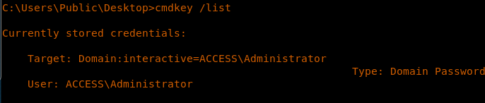 20. We can also see this with the cmdkey command, where Admin creds are listed to be stored.