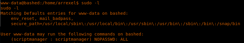 24. The first thing to always check for is what users can sudo as. Here we can see that the current user, arrexel, can run commands as scriptmanager.