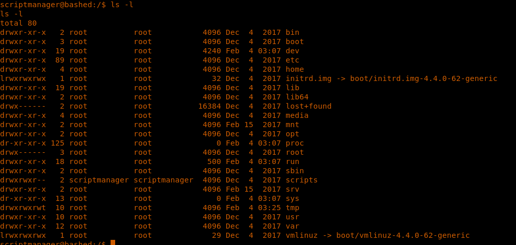 26. After browsing into the / directory, it looks like all the files are owned by root, whereas only one file is owned by scriptmanager.