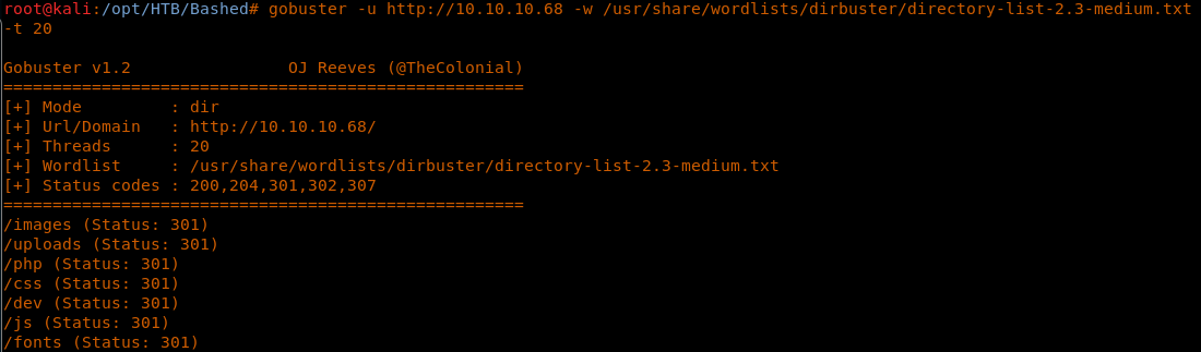 <<gobuster -u http://10.10.10.68 -w /usr/share/wordlists/dirbuster/directory-list-2.3-medium.txt -t 20>>