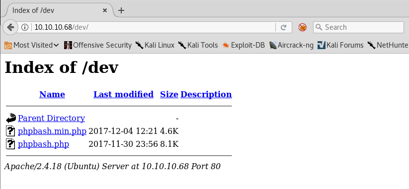 7. Above, we can see that there are lot of enticing directories on this box, but the ones that catch our attention are dev and upload.