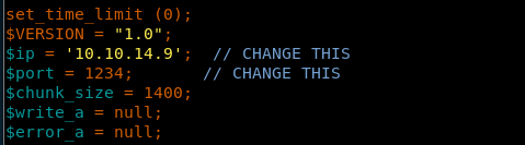 12. First, let’s customize the shipped-in php reverse shell with our machine IP and the port on which we want to listen the connection.