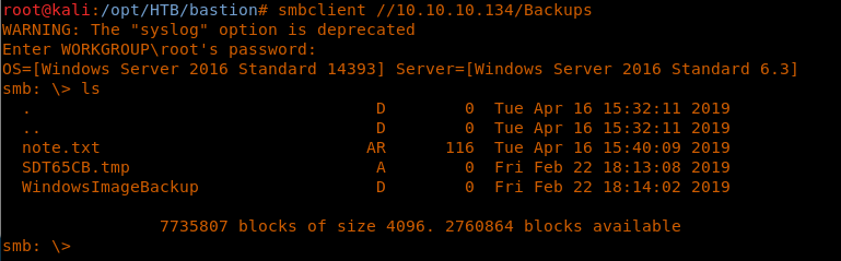 <<smbclient -I 10.10.10.134 -L Bastion>>