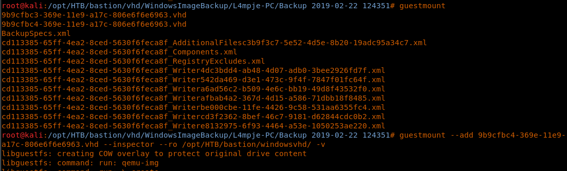 <<guestmount --add 9b9cfbc4-369e-11e9-a17c-806e6f6e6963.vhd --inspector --ro /opt/HTB/bastion/windowsvhd/ -v>>