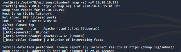 nmap -sC -sV -oA Blunder 10.10.10.191
