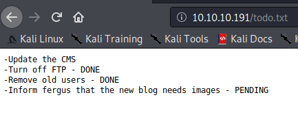 - Hovering over to todo.txt, we got TODO items below. Seems like “fergus” is a user on the system.
