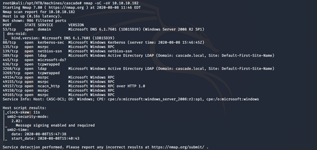Command used: nmap -sC -sV -oA Cascade 10.10.10.182 - Since so many ports are available and looking at them from a usage perspective, this seems to be a domain controller.