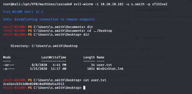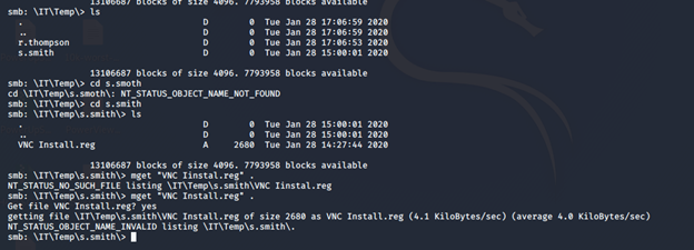 - With all of the information recovered above, we can try to use the decoded VNC password with s.smith, since the file was recovered under that user folder. If this will not work, we also have multiple usernames recovered from initial enumeration. But the s.smith username worked, and we can now grab the user.txt as shown below.