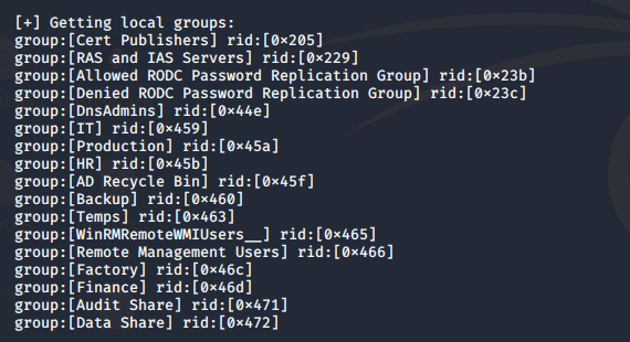 - We’ll run enum4linux on the machine to enumerate more information about it. It reveals following usernames and groups.