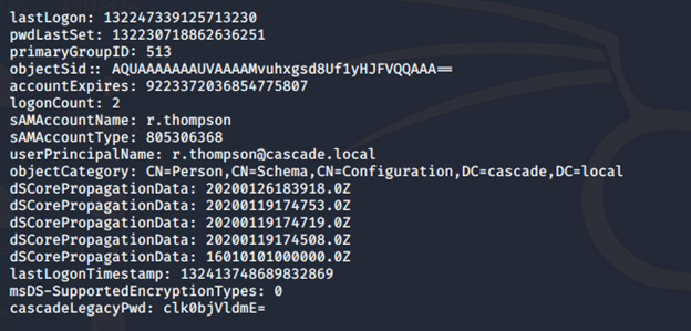 - ldapsearch output reveals a password (cascadeLegacyPwd).