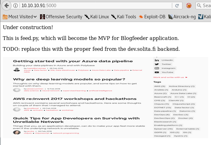 6. Let’s start browsing port 5000. Below is the landing page. We can see an indication of feed.py being present somewhere.