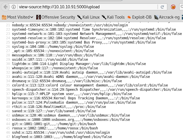 10. Uploading this file via the upload page results in a capture of /etc/passwd. Awesome.